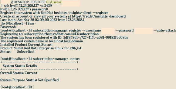 - 명령어(관리자 권한): subscription-manager register --username <레드햇 가입 계정ID> --password <레드햇 계정 비밀번호> --auto-attach
